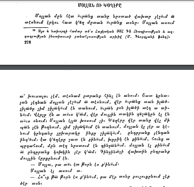 –Հասի՛ր, էդ կլեկչուն կա՛նչիր, ամանները տանք, կլեկի,– ասավ մայրս։ Խաղս թողեցի, ընկա ուստի ետևից կանչեցի։ Դուրս եկավ, որ կլեկչի չէ, այլ մեր ազգականի փեսա տիրացու Սհակն է։ Սկսեցի զրույց անել։ Տիրացուն խոսք բաց արավ իր գիտության մասին։